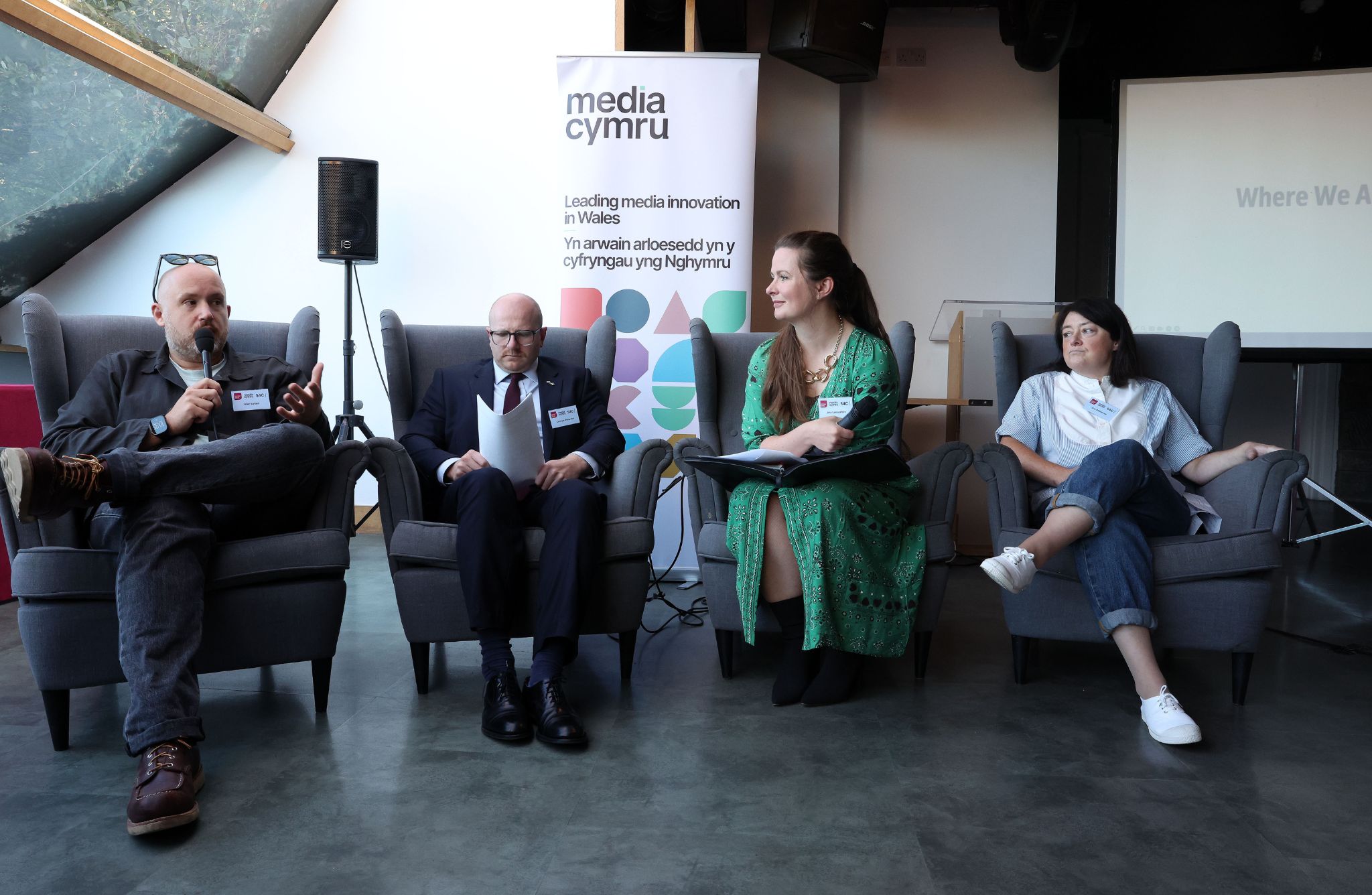 Roedd panel olaf y dydd yn cynnwys edrych ymlaen at y dyfodol, a chlywed am ddulliau a strategaethau ar gyfer parhau i adeiladu ar y gwaith gwych sydd eisoes ar y gweill i normaleiddio a chefnogi rhieni yn y sector sgrin ymhellach.