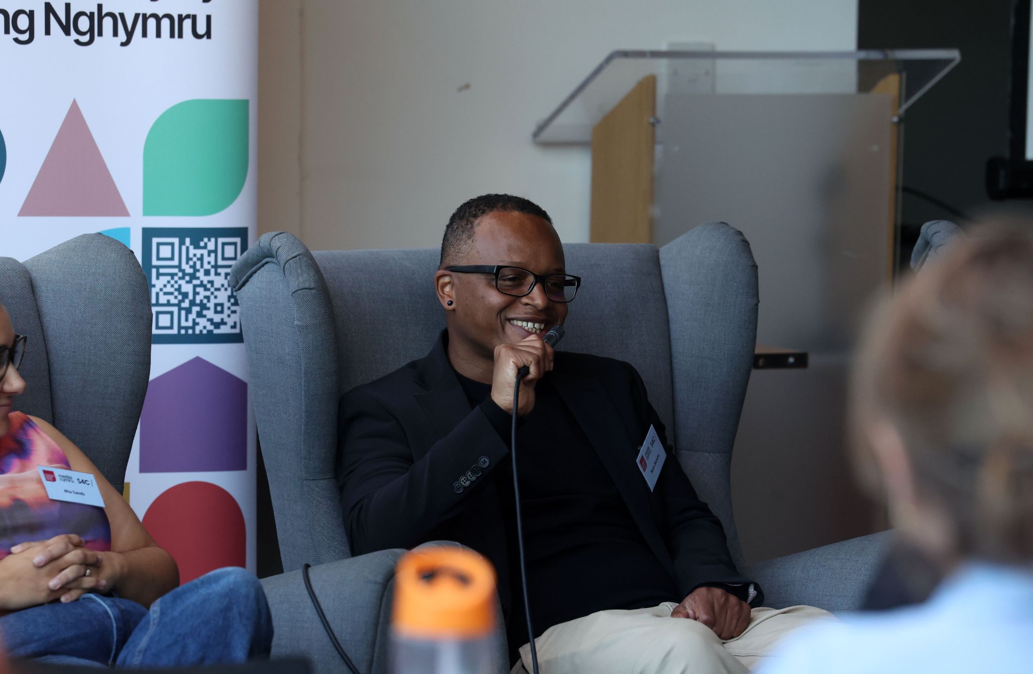 Roedd y trydydd panel yn darparu lle diogel lle roedd rhieni yn gallu rhannu eu straeon eu hunain. Clywsom gan fam a barhaodd i ddatblygu ei gyrfa, gan gydbwyso’r cyfrifoldebau newydd o fod yn rhiant a gyrfa ar ôl genedigaeth, tra bod y gŵr yn aros gartref i ofalu am y plentyn, gan riant mabwysiadu sy’n ceisio ffyrdd newydd a gwahanol o weithio wrth i brosiectau newydd ddod i fyny, a mam sy’n dal i ddod o hyd i amser ar gyfer gwaith creadigol, tra’n rhiant i bedwar o blant.